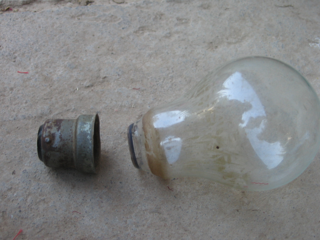 将这些材料备全以后,我们就开始做了,我们先要把灯泡的接电处取掉,但要非常的小心,一不小心就会把灯泡弄破。