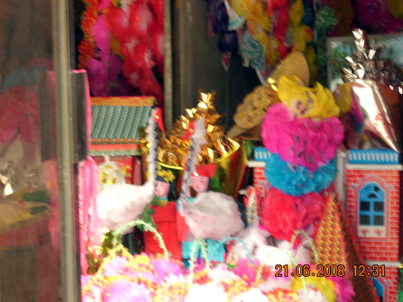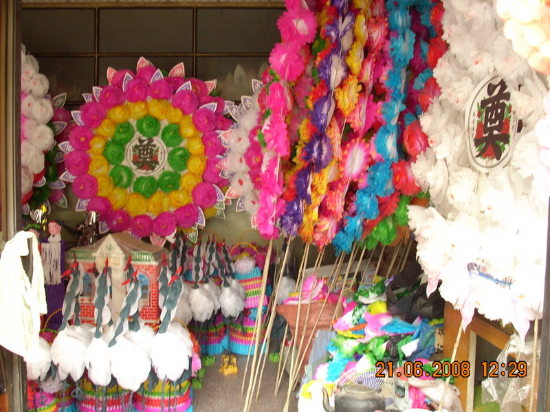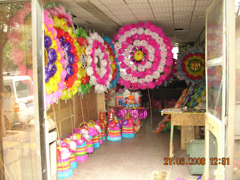 首先,他们会从商店购买各色质地良好的纸料和剪纸用品,如剪刀等,还有易弯折的木料,如竹子(有时他们也会用细铁丝代替木料).然后,艺人们通常会进行明确的分工(几个有剪纸善长的艺人专门聚在一起剪出各样的纸样,如桃形,正方形或像鸟羽一样等等;其他艺人则专门做花圈或纸叠品架子,做出的架子花圈通常是圆形的,而纸叠品的则 会有多种多样,像笼子的,像船的,像白鹤的或像神童的......样子不一,可有风采了;艺人们也是边做边说说笑笑的,对他们来说 工作便是极好的娱乐方式。艺人们心情愉快了,做出的纸叠品和花圈也便活灵活现了)。等以上工序准备就绪后,艺人们便开始合作致力于花圈和纸叠品的加工,点缀和成型工作了。剪好的纸样,做好的模架和胶水,钉子被艺人们巧妙的运用后,就会给我们创造出一个个极距艺术美和生活风采的花圈和纸叠品。