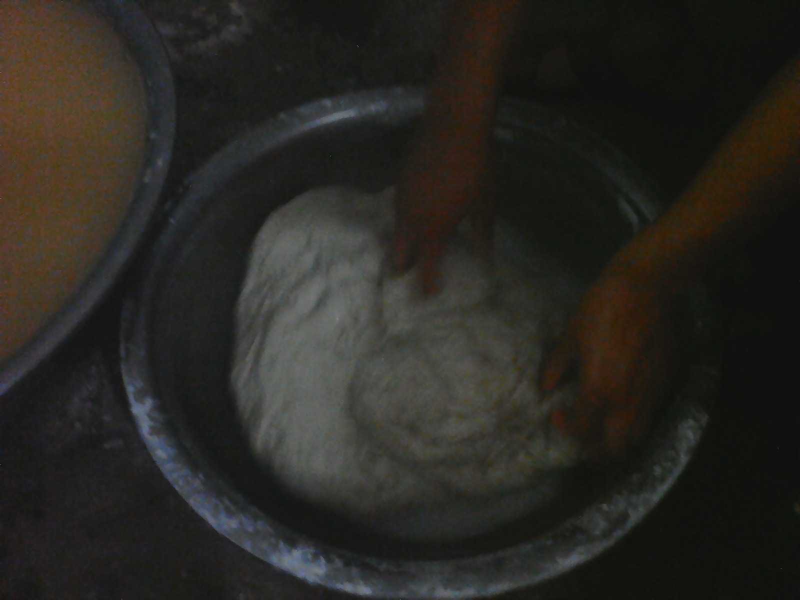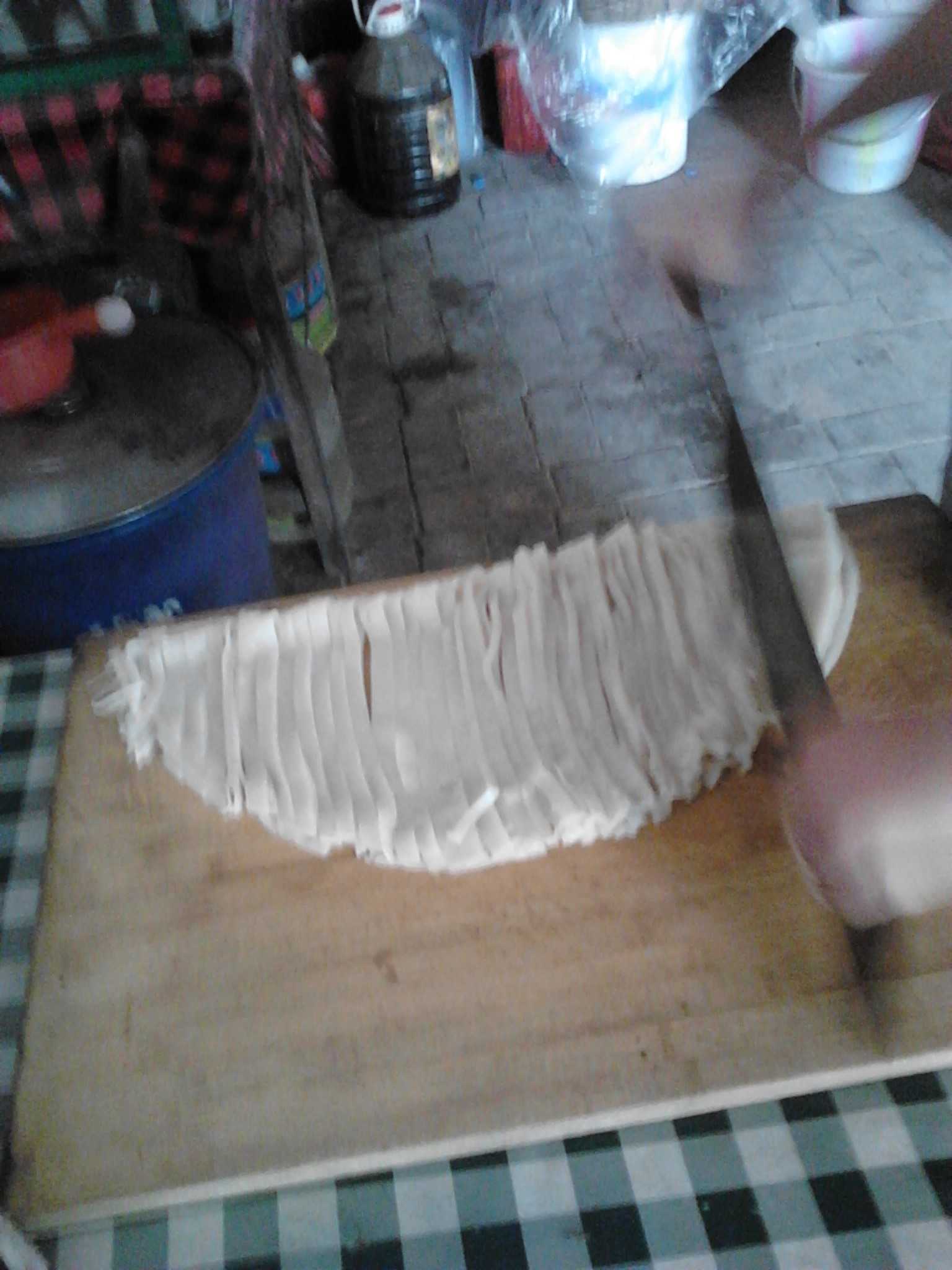 第二天早上,将静置好的淀粉上面的水倒掉,然后加加入少量清水搅匀。用勺取适量的面水盛入锣锣内,轻轻摇晃锣子,使面水平摊均匀。然后放入开水锅里,盖上盖子,火越大越好。蒸两分钟,把锣子从开水锅里拿出来,放到案板上,5秒后,即可取出。