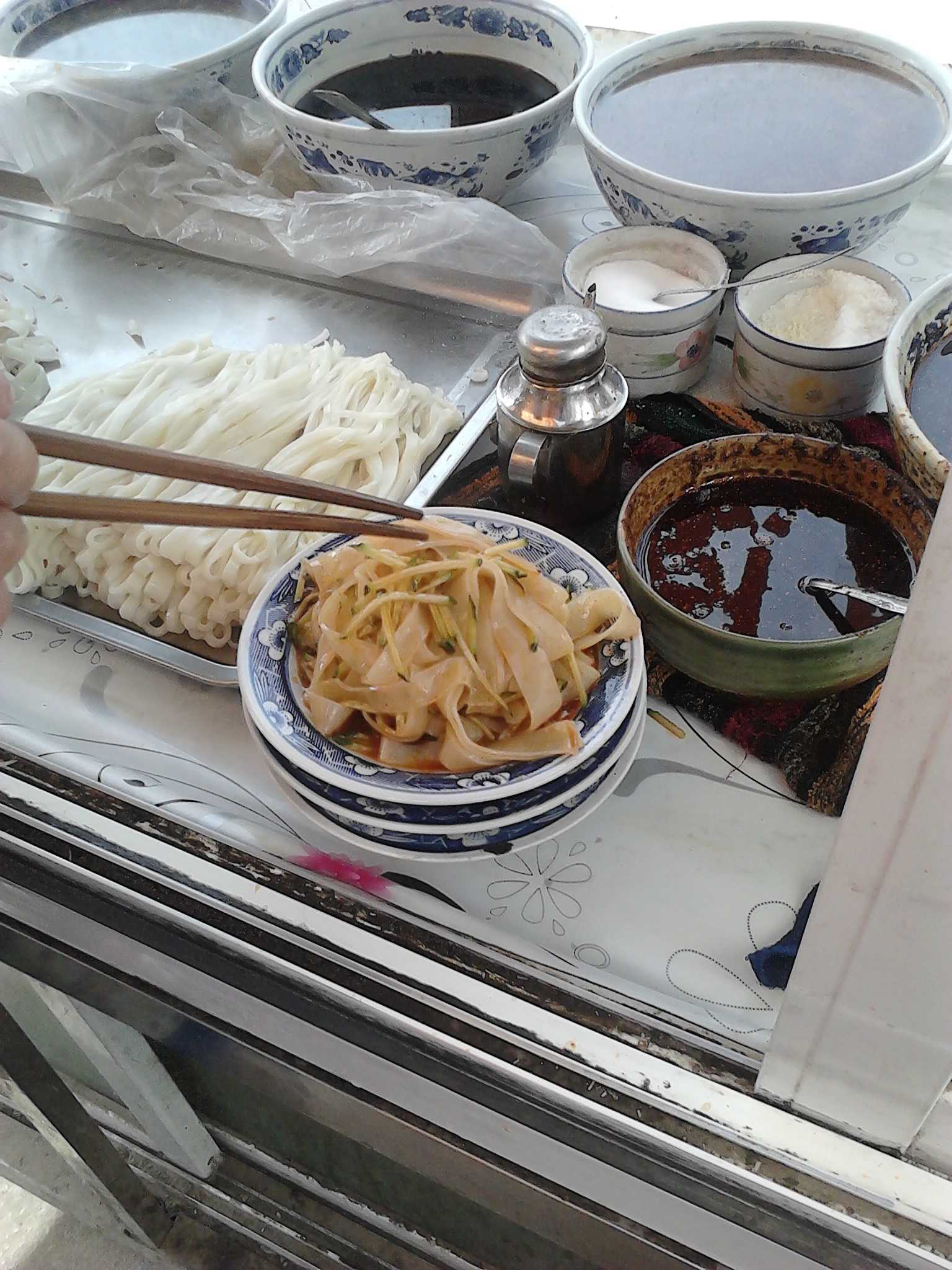 食用时,将面皮和面筋切成条形,加上豆芽和调料,调匀即可食用。当我看见顾客吃下香甜可口的面皮时,我的心里就有一种说不出的美,这就是我们家的美味佳肴—面皮。