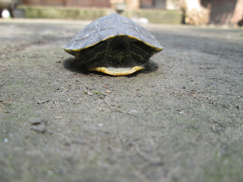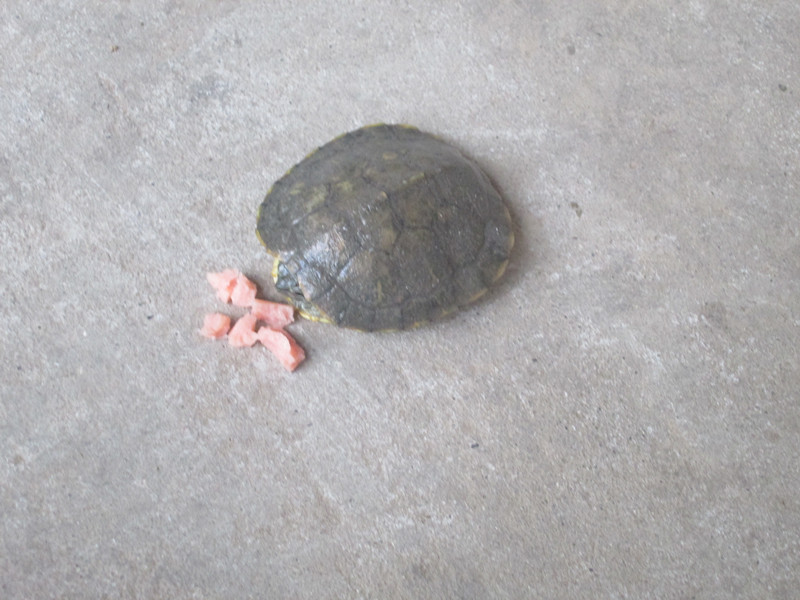 小乌龟不但长得漂亮,也很难伺候。有一次,我拿着一根火腿去喂它。把火腿用刀切成小块,然后把它放到盆里。没想到小乌龟只是爬过来闻了闻,就高傲的走开了。我见了很纳闷,心想:人人都想吃的火腿,到了它这可就一文不值了,可还得喂呀。我只好再换一样食物——肉,我还得把肉撕成小块,再放到盆里,小乌龟像饿昏的食肉动物一样,快步爬起来,叼起肉伸起脖子;吞进肚子。