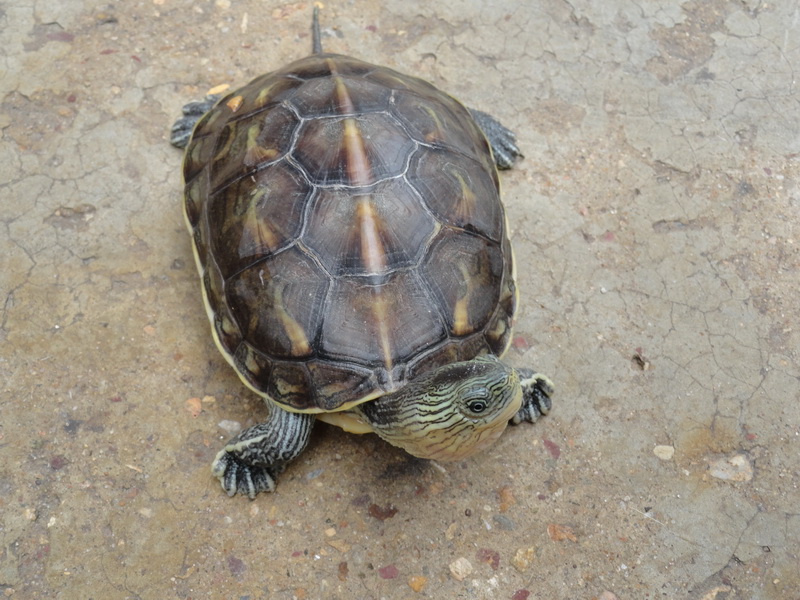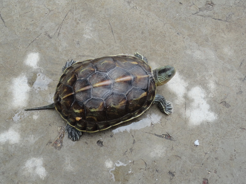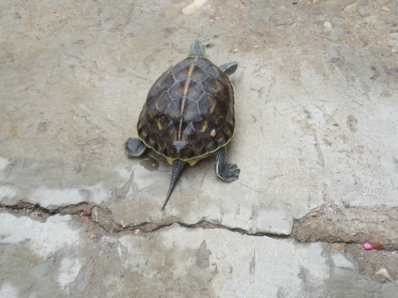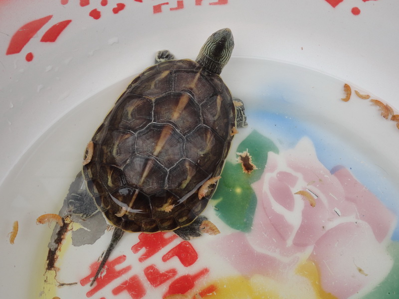 小乌龟的嗅觉特别灵敏。我把肉放在离它很远的地方,它都能闻到,慢慢地爬过来,张开嘴巴,把肉吞进肚里。乌龟不需要天天喂,一顿饱餐之后,它可以好几天不吃东西。