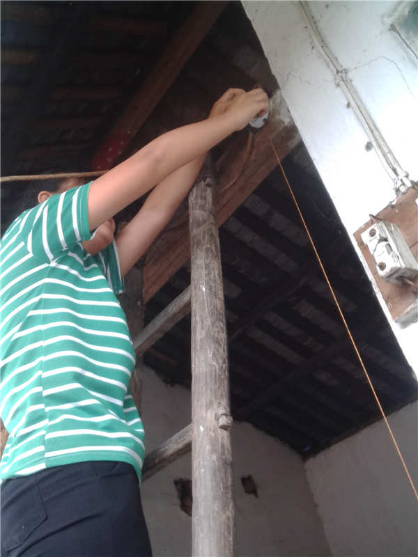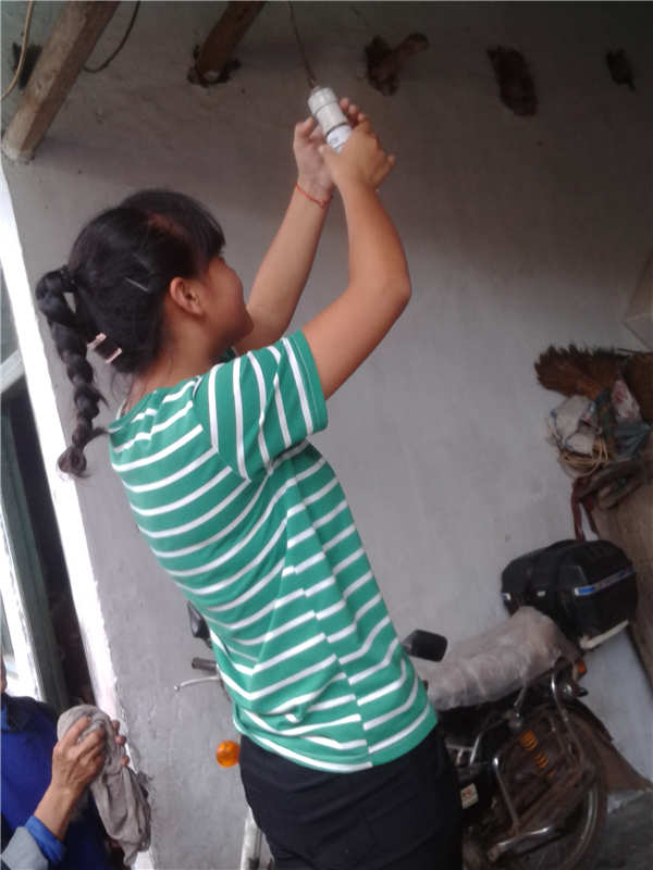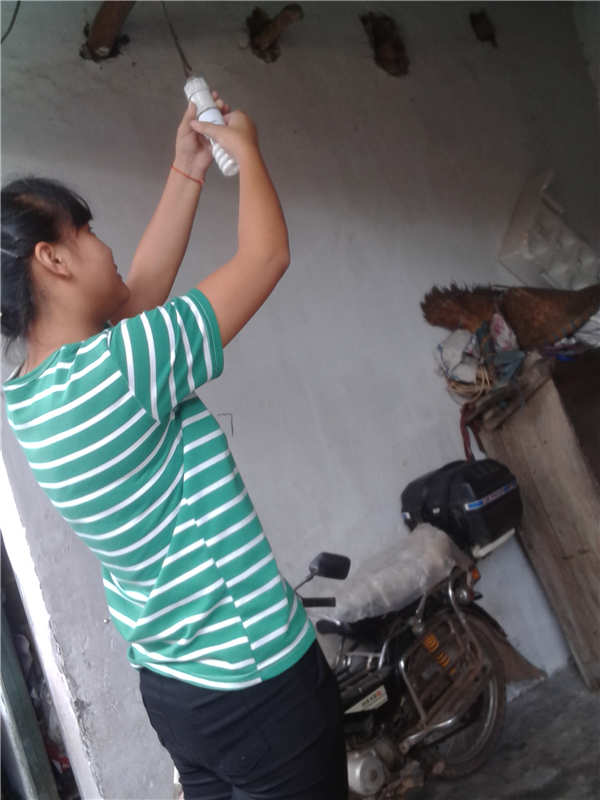 所以,就只有我来换了,我搭了一个凳子后就能换到灯泡了,家里的灯泡是那种长得像蛋一样的,开灯之后发出的光是黄光,不怎么亮。它的头是螺丝型的,我转了几圈,然后拿下来,再换上妈妈新买的灯泡,这样就大功告成了。