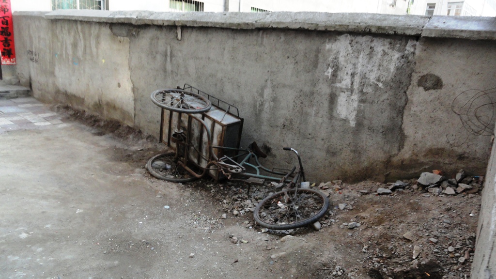 现在街边乱停乱放的情况已经越来越严重了,看!就连这辆破旧的三轮车也随意停放,这大大地造成了人们生活的影响。