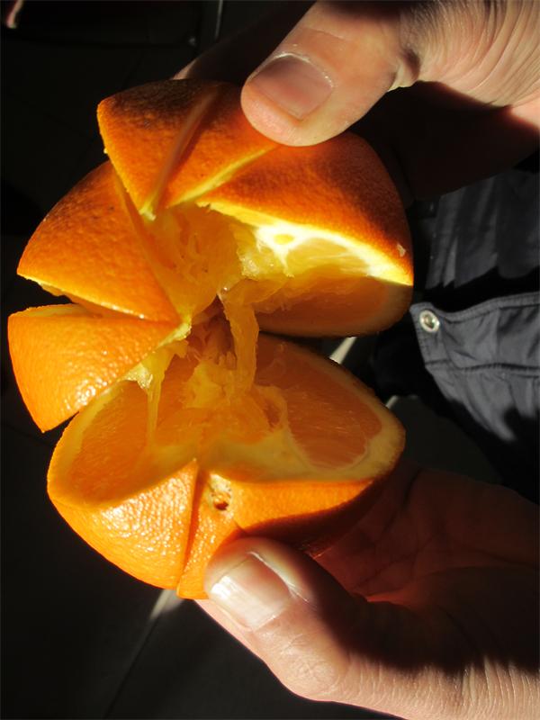 几乎人人都爱吃香橙,有营养的它当然也是我的最爱。橙子一般都是橘黄色的,又圆又大,像一个大拳头。外面的皮有一个个突然的小点,上面还有一小块切点。香橙的味道好极了!酸甜的,果汁也很鲜美,特别是它的果肉,软软的嫩嫩的,咬一口,就像是舒畅地漂浮在橙园上空。