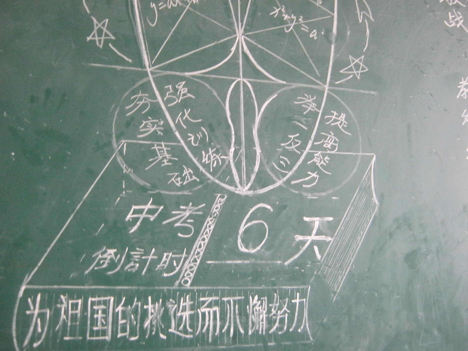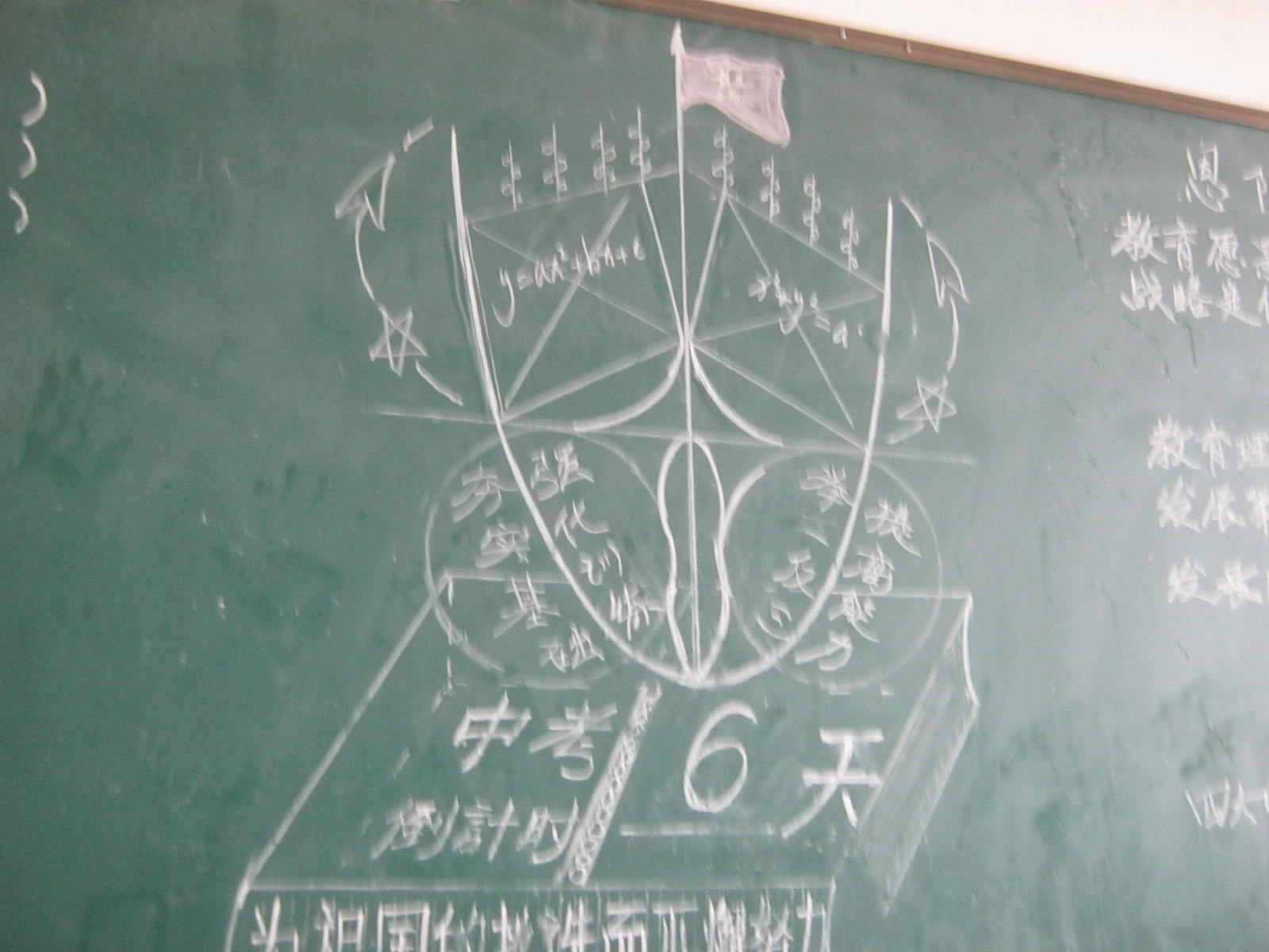 远看犹如一艘远洋的航船,船的下面垫着一本书,给人一种书海泛舟的感觉。书的正上方还有一句提醒我们的话:中考倒计时,XX天。老师刻意把数字写得很大,时刻提醒我们。数字显得很醒目,有一种鹤立鸡群的感觉。站在教室的任何地方都能很清楚的看见。