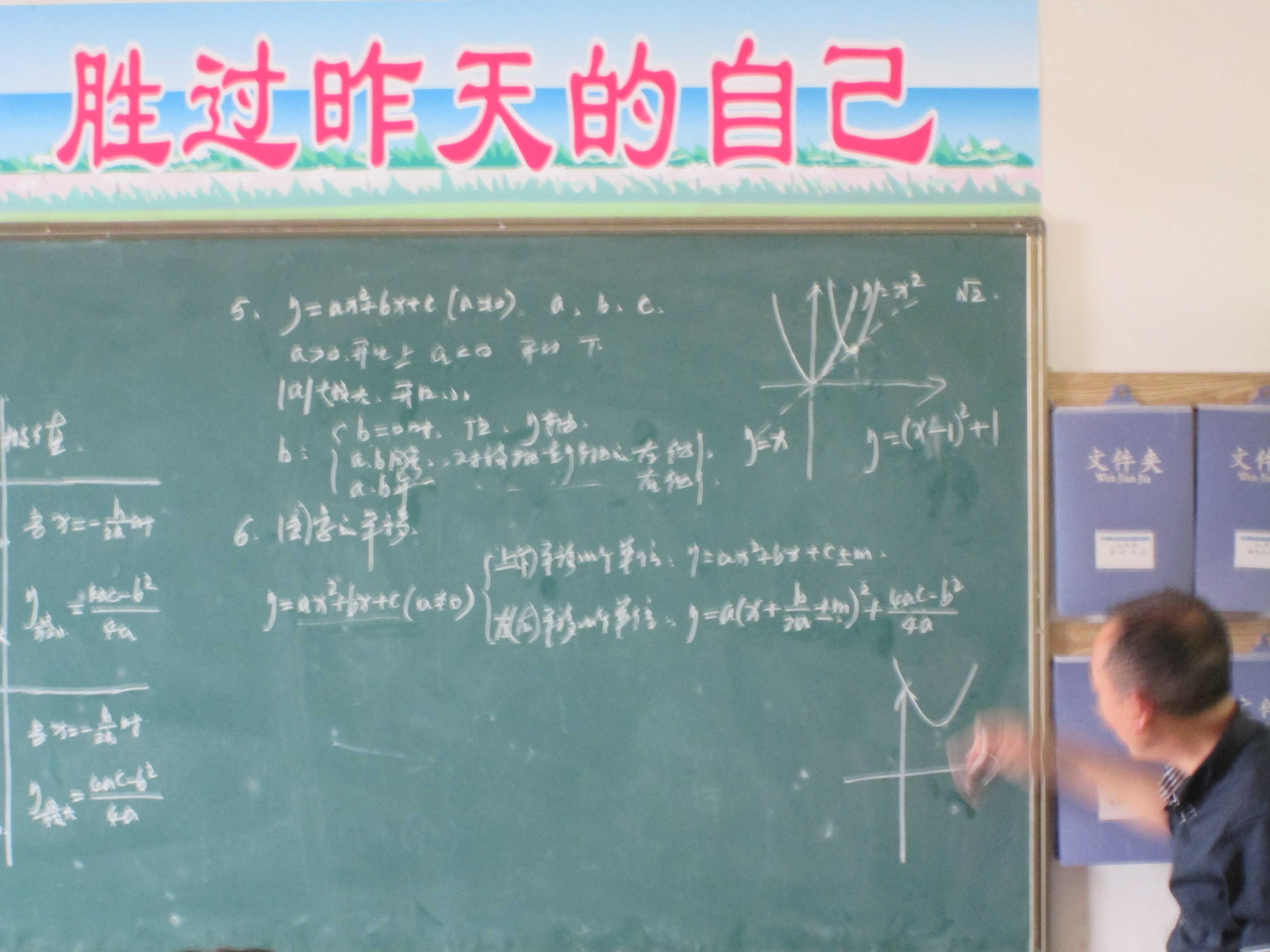 走近看,船的头顶有一根桅杆,上面插着一面飘扬着的五星红旗。与五星红旗相映衬的还有一句话:为新中国的挑选而不懈努力。这艘船的构造很巧妙,用上了许多的数学知识,有二次函数的抛物线及其关系式。还有各种平面图形,旁边写上了勾股定理。估计老师是想让我们把这些知识掌握的更牢固吧!"中考倒计时"更加吸引人的眼球,也许这句话才是老师想突出的中心吧!