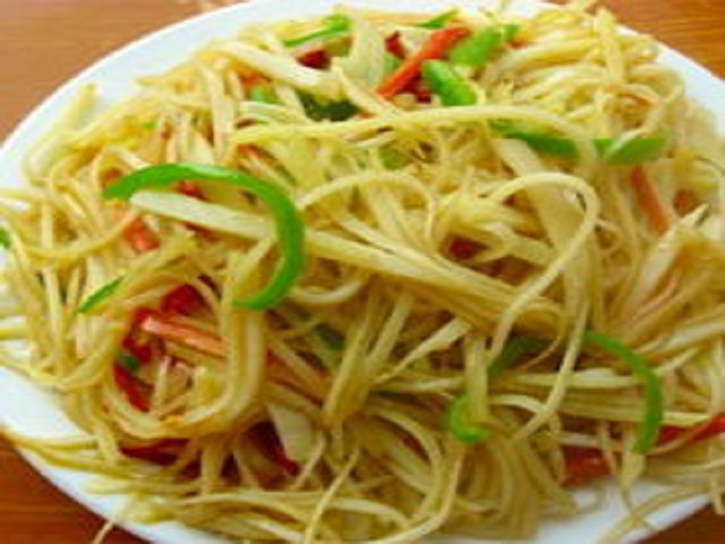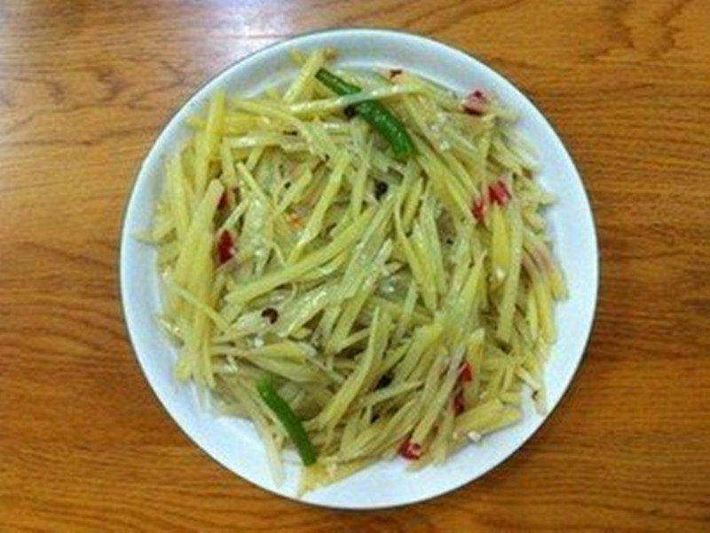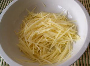 接下来我就在厨房里忙了起来。先将土豆拿到水里洗干净,再把土豆的皮去掉,然后切成细细的丝。当时我以为这是一件很容易的事,可不是我想象的那样。我一只手拿土豆一只手拿刀,我将土豆拿到菜板,一刀一刀地切,先将土豆切成片状,再垂直于片的面切成丝,大约切了十五分钟,一盘细细的土豆丝就切好了。然后将土豆丝放到盐水中泡一下,除去土豆的淀粉,这样做是让土豆丝更脆。