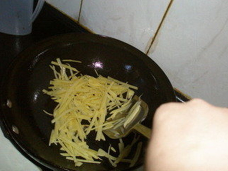 接下来我准备了一佐料:青椒丝、味精、盐等。开始炒土豆丝了,我先将天然的菜籽油倒进锅里,等锅中油的泡沫没有了,就说明这油已经烧开了,然后将土豆丝放进锅里炒,大约炒了两三分钟就可以把一些佐料放下去再炒一炒,然后就可以起锅了,这样一盘美味的土豆丝就炒好了。
