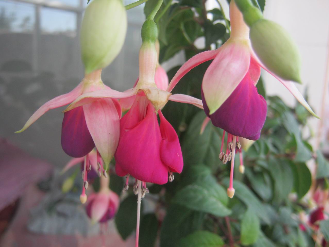 铜锤又叫倒挂金钟,这是为什么呢?你看看它的花朵就知道了,它的花是向下生长的,顶部是四片花萼,下面是紫色的花瓣,从里面长出几个长长的花蕊,它的样子不像是戏文里大花脸拿的铜锤吗?