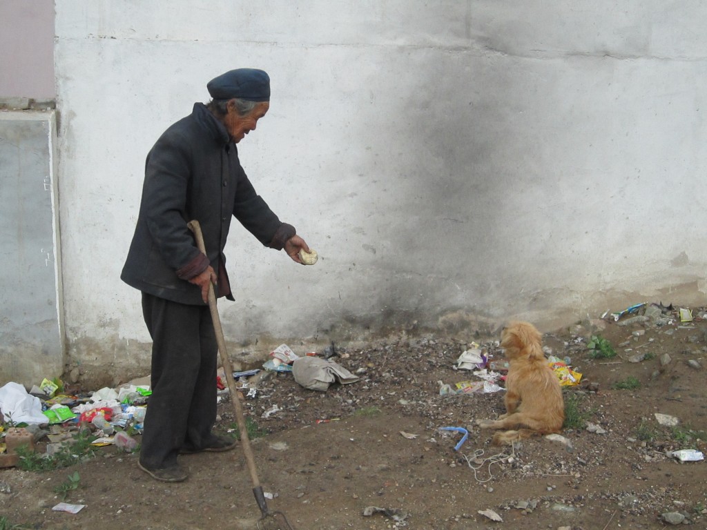 学校后面还有一群流浪狗,每当老奶奶翻捡垃圾的时候,它们也和老奶奶一起翻捡。老奶奶捡到同学们丢弃的馒头时,便会给这几只流浪狗吃,从不会拿回家去给家里的猪吃。她明白,没有了吃的,这些流浪狗会饿死。
