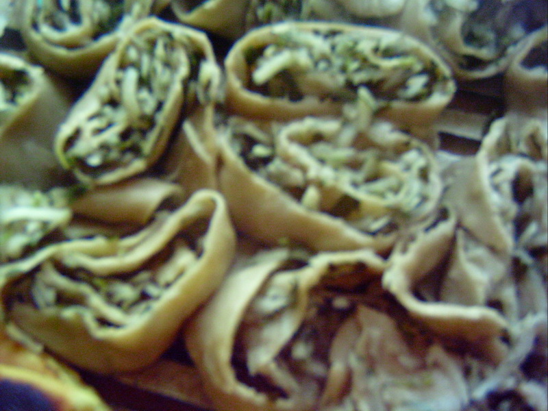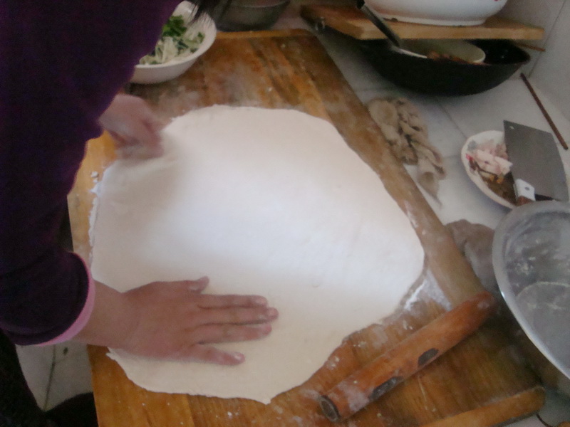 准备好往饨饨里掺合的馅,比如:山药丝、韭菜、葱、胡萝卜丝,切好了放在一起。把它们均匀地撒在刚擀好的皮上,把皮卷起来,用刀切成一个一个的长方体,再往回折叠。之后把它们都放在小笼子里面,坐进锅里去。