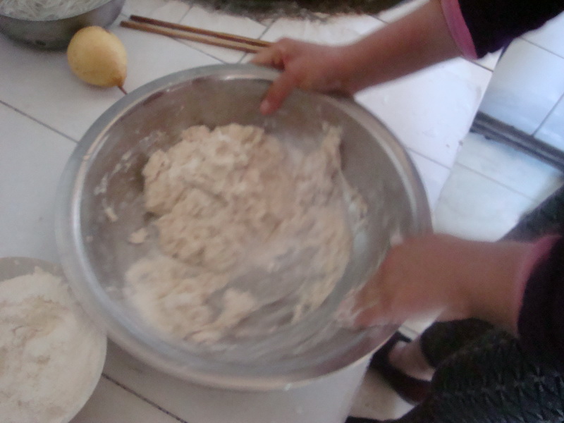 首先我们要把莜面粉倒入一个小盆子里,接好一碗冷水,倒进装满莜面粉的小盆子里去,用手抓的方式和好面,再用擀面杖小心的将和好的莜面擀成薄薄的皮。