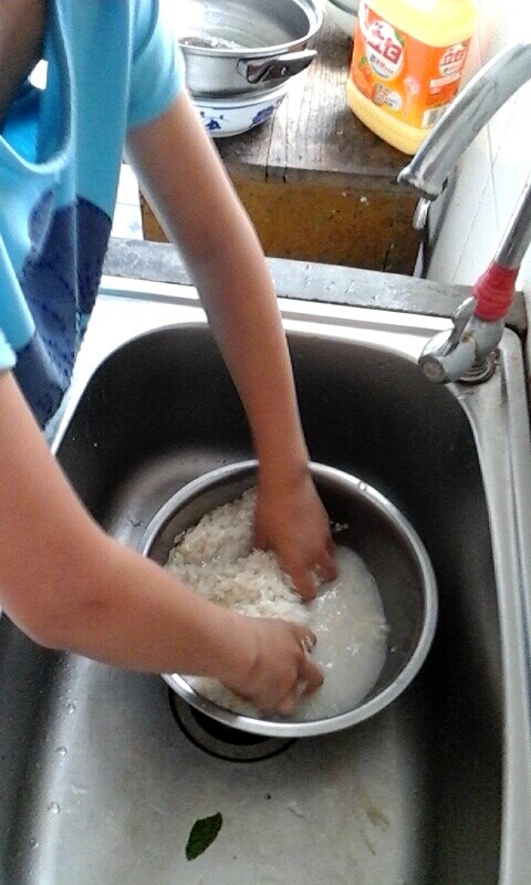 我在盆子里装满水,用手来回的搓,可是米里面的糠实在洗不干净,我只好把米倒出来,一粒一粒地把糠捡出来,扔进垃圾桶。可一不小心,把米全倒进去了,吓坏了我。