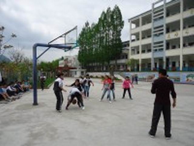 下来就让我们看看激烈的篮球比赛吧! 当你看到一个队容不整,高的像楼,矮的像草的队伍,那就是我们班的。这时,我们正与九四班进行激烈的对抗,现在四班的分数遥遥领先,但我们运动员们仍坚持不懈,顽强抗争,尽力拉近和四班的分数距离,场地两边的拉拉队队员们还不断大声喊着"加油"。