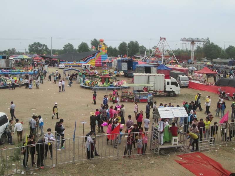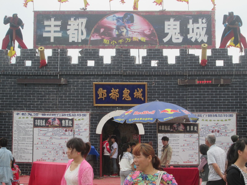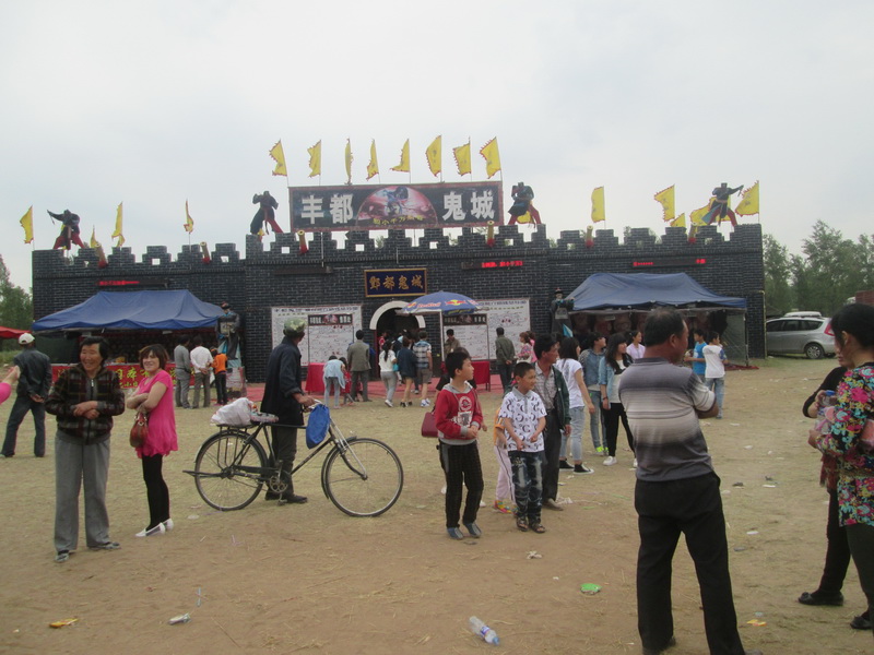 一会儿,我们走到了一个用木头搭建的房子旁边——"鬼城"。鬼屋的两侧有两个"僵尸",一个敲着锣,一个伸着臂转圈。 我们来到这里一个个都望而却步,大头却兴致勃勃,吵着要进去,又去问了门票钱。她兴冲冲地对我们说:"进去吧,今年的鬼屋扩大范围了,五块钱不限时间,出去还能进呐!走吧走吧!"