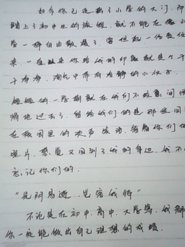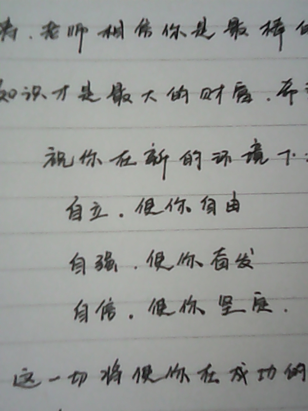 紧接着,我又翻开了第二页,上面只写了三句话:"自立,使你自由。","自强,使你奋发。","自信,使你坚强。"这几句短短的字语,至今让我铭记在心,就是这几句话,才让我不断进步。翻动它,可以让我寻找到曾经的往事。它就像时空隧道,在里面穿梭出淡淡的"回忆","思念" 与 "牵挂"