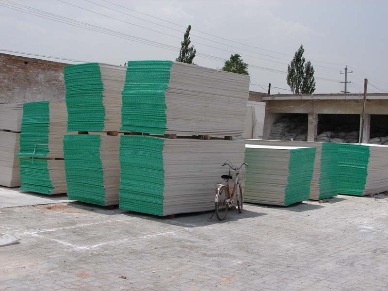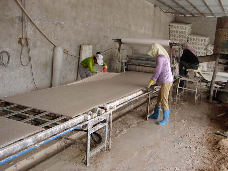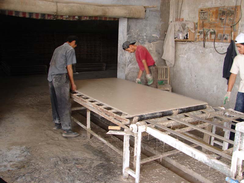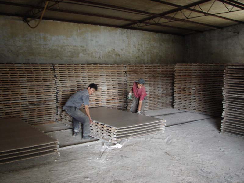 不是抬到别出去了,而是被抬到一个大的仓库中。这个仓库是专门用来烘干加工好的带有水份的板子的,里面当然需要温度,进去以后会有一定的潮湿感。烘潮需要两天左右才可完成。我感到很奇怪:为什么不直接在太阳底下晒干,工人叔叔告诉我,带潮的板子只要一见太阳,刚才压制的塑料网和锯末就会起皮。