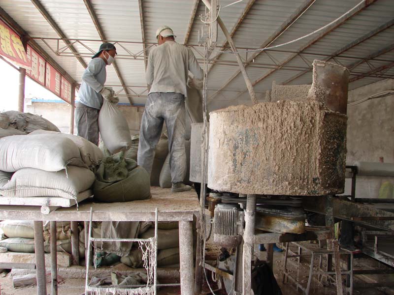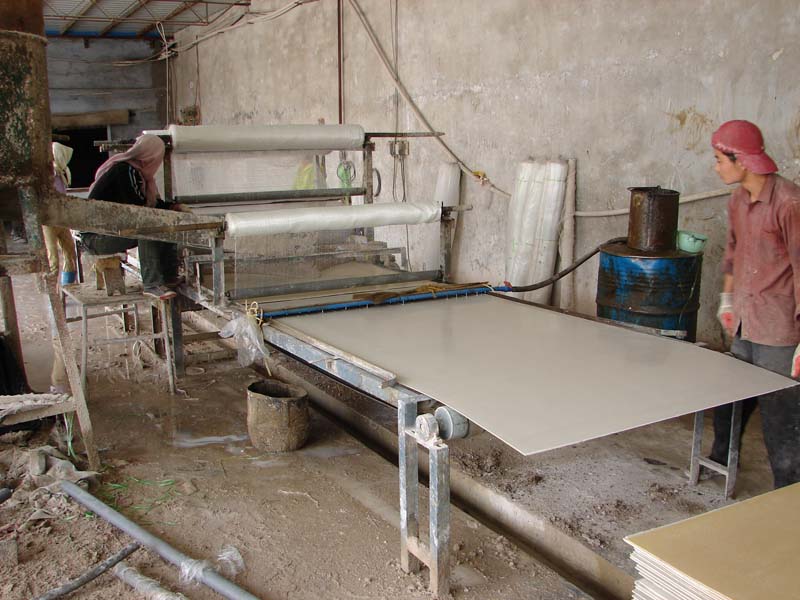 这个工人正在把"粗板"(用是高峰压制成1厘米厚的板子)送入合网流水线。那两个圆轴上裹着塑料网,随着"粗板"的送入,塑料网就被压到了"粗板"上。