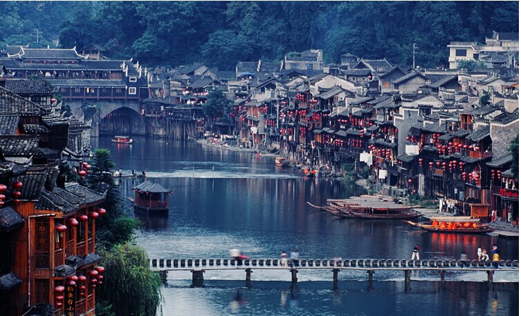 凤凰古城分为新旧两个城区,老城依山傍水,清浅的沱江穿城而过,红色砂岩砌成的城墙伫立在岸边,南华山衬着古老的城楼,城楼还是清朝年间的,锈迹斑斑的铁门,还看得出当年威武的模样。北城门下宽宽的河面上横着一条窄窄的木桥,以石为墩,两人对面都要侧身而过,这里曾是当年出城的唯一通道。
