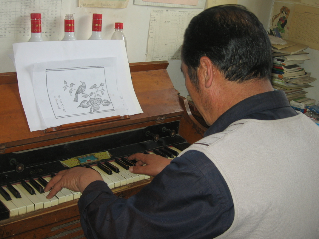 他有一件很小的卧室,从门里进去右面首先是一张桌子 上放着一摞摞教学资料和学生的作业,在桌子的右边放着一架钢琴 。虽然是一间很小的卧室但他收拾得干干净净。