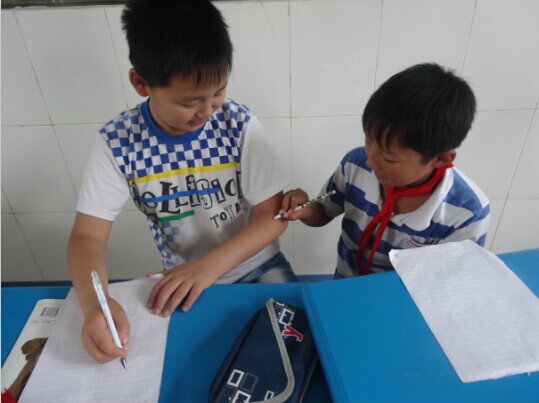 突然,我身旁的同学不知为什么打起了"毛笔大战"。只见李云鹏以"迅雷不及掩耳之势"一笔画在了张婷的手上,那里立刻出现了一条"一字眉",张婷一抬手在李云鹏的额头上点了一颗"美人痣",他们俩的战斗让我情不自禁地笑了起来。