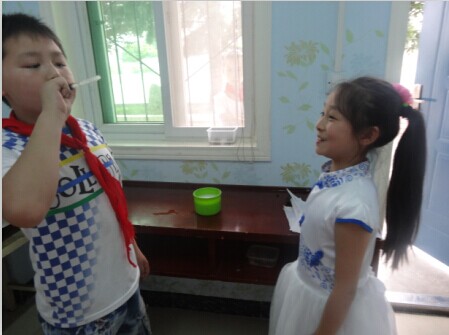妹妹看见我吹了一个泡泡后,她特别高兴。说要让她来吹。吹了好几遍都没有吹出来,结果是她没有倒够洗衣粉。最后她又倒了一些,没有想到她吹的泡泡比我吹的还大呢!