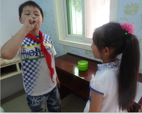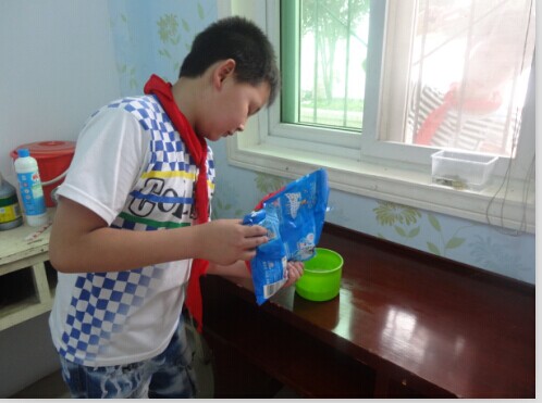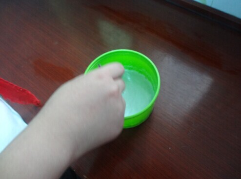我们俩一人找了一个杯子、洗衣粉、洗洁精、两根笔壳。我们先把洗洁精和洗衣粉倒进杯子里,加入了一些水,然后搅了一会。然后就把笔壳放入杯子里,取出来就可以吹泡泡了。
