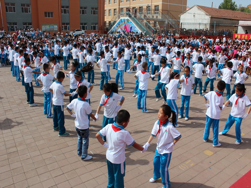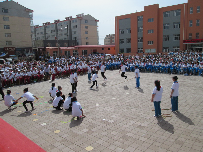 大约八点时,我怀着激动的心情搬着椅子来到事先分好的位置上,坐成一个"方阵"等待着。 大约过了五六分钟,表演开始了。第一个节目是"集体舞。"表演的同学入场时,跳的是兔子舞;在操场中央时,跳的是团体舞;退场时,是骑马舞,每个舞跳得是那么有力、那么青春。第二个节目是"绳彩飞扬",表演者是四年级的同学们,这个节目更是精彩,让我们激动不已。