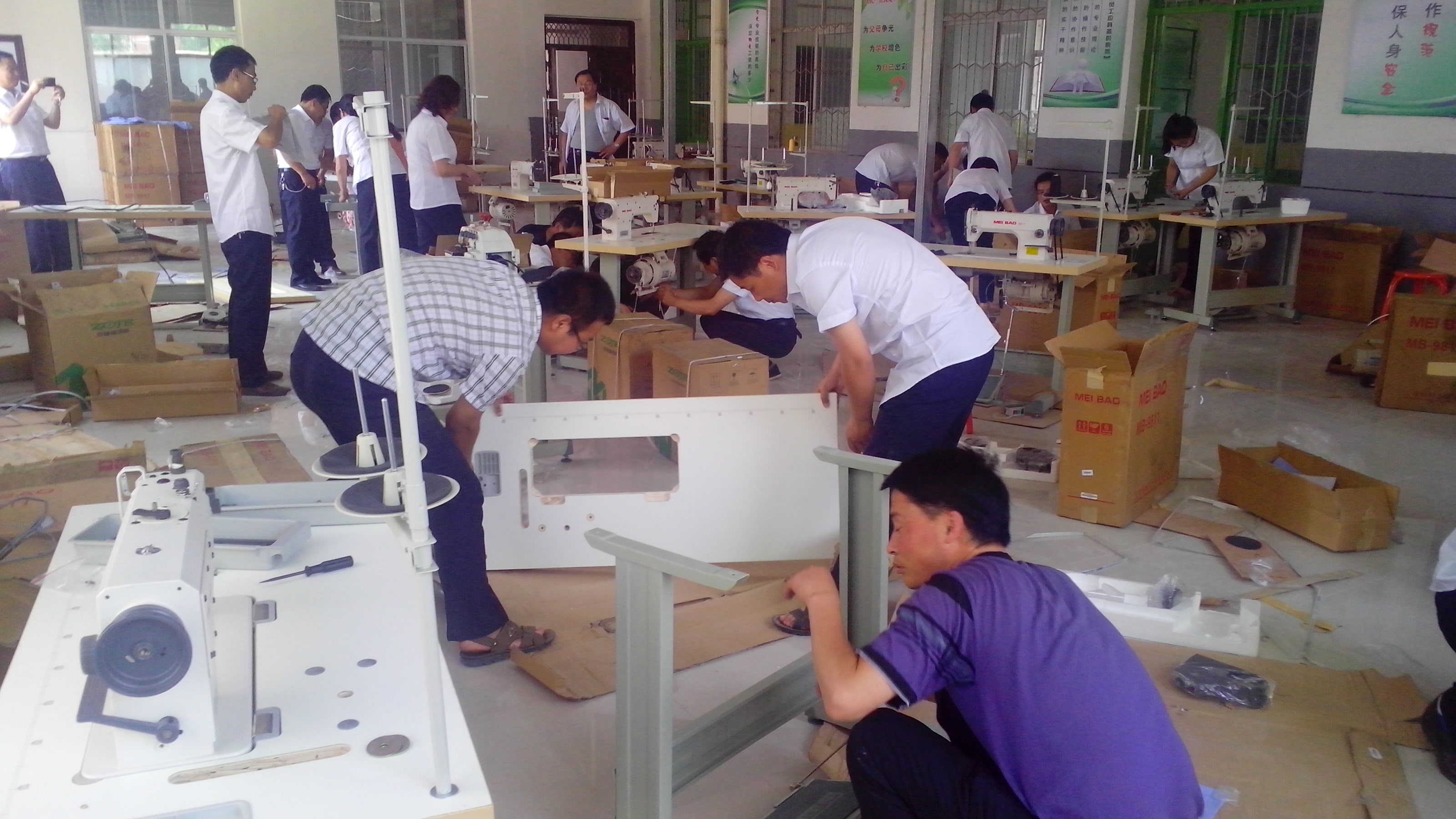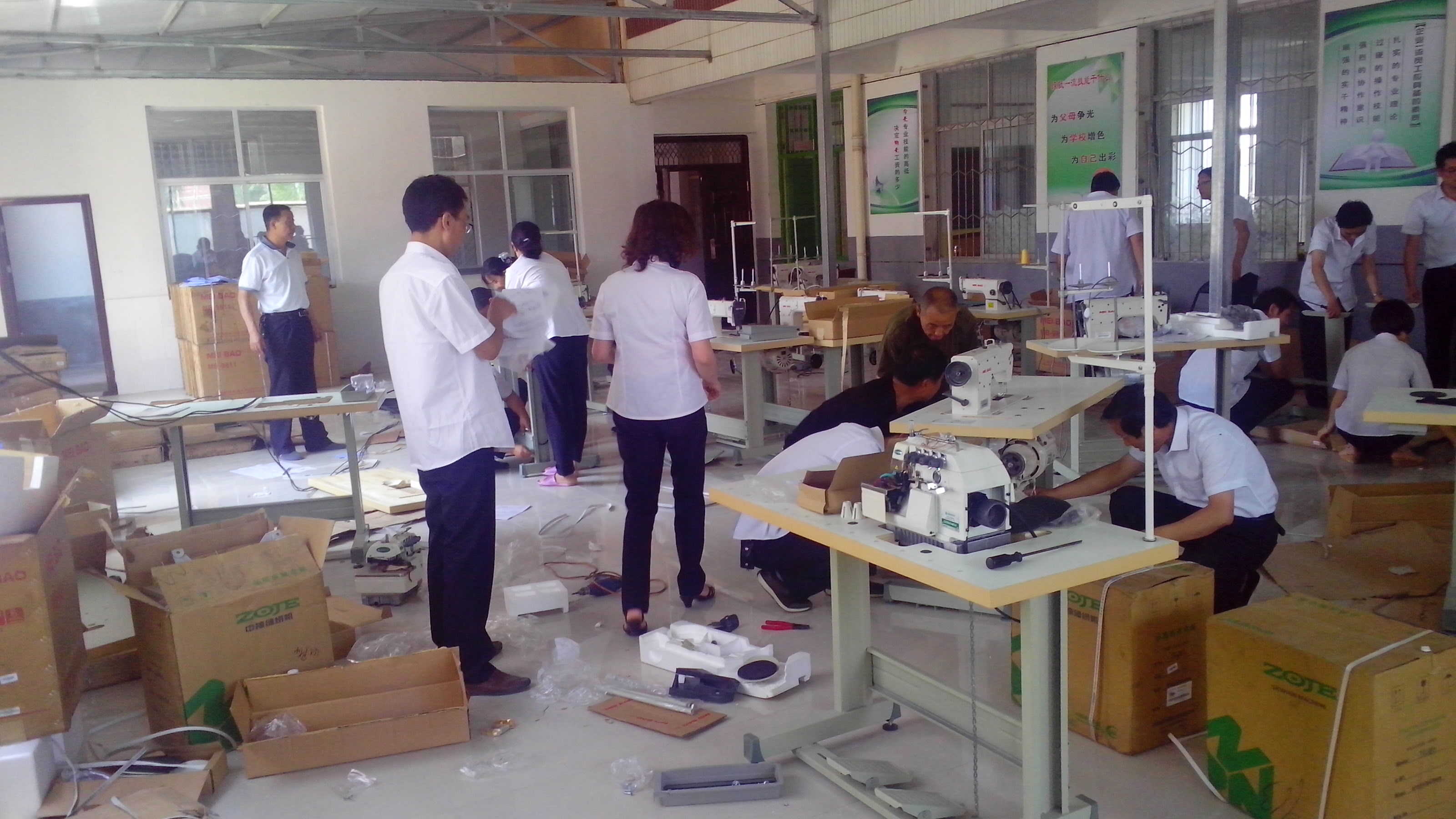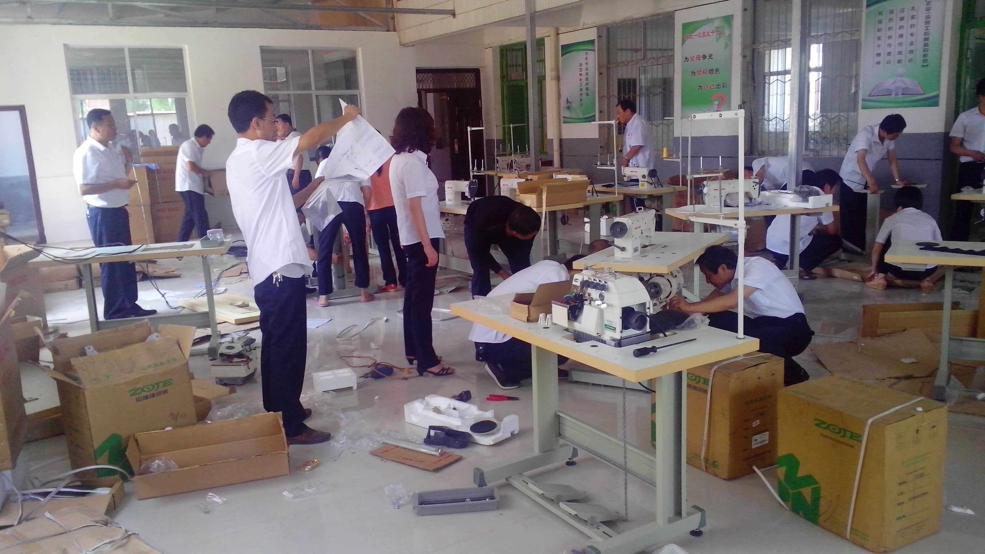 我们服装班的学生和老师都没有装过实训机器,在师傅的简单培训下,我们分成4个小组,由组长负责展开工作。
