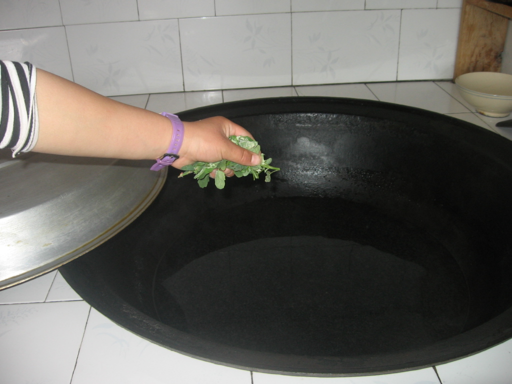 接下来就要晒灰菜了。灰菜有两种做法。第一是晒,将灰菜晒干。第二,将刚掐来的新鲜灰菜直接做。做法是烧一锅沸腾的水将灰菜倒入锅里,用烧水炸一会儿。也可以将灰菜晒干放到冬天炸着吃。