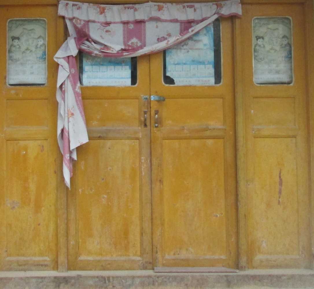 这种门是很好玩的。有一次,到了中午爸爸妈妈还没有回家。我在门口等了差不多半个小时了,正在不耐烦的时候我突发奇想,找了一个尖一点的石头,把那三块板下面的小槽往宽里挖,挖好之后把最右边的往左边一抬,把脑袋钻进去之后,身子斜斜的侧着就爬了进去。
