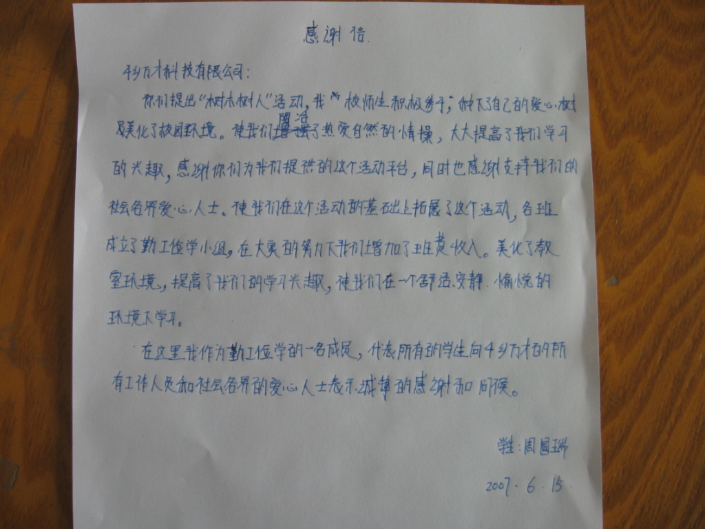 勤工俭学真好。它不仅能保护环境,而且对我们很有利益。同学们!希望你们继续保持这种优良的品质。同时感谢"千乡万才"公司为我们提供的网络活动平台,使我们更加的投入到自己的学习生活中来。好多同学为你们写了感谢信。
