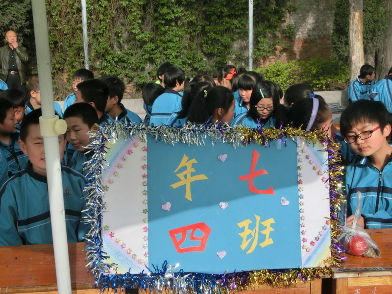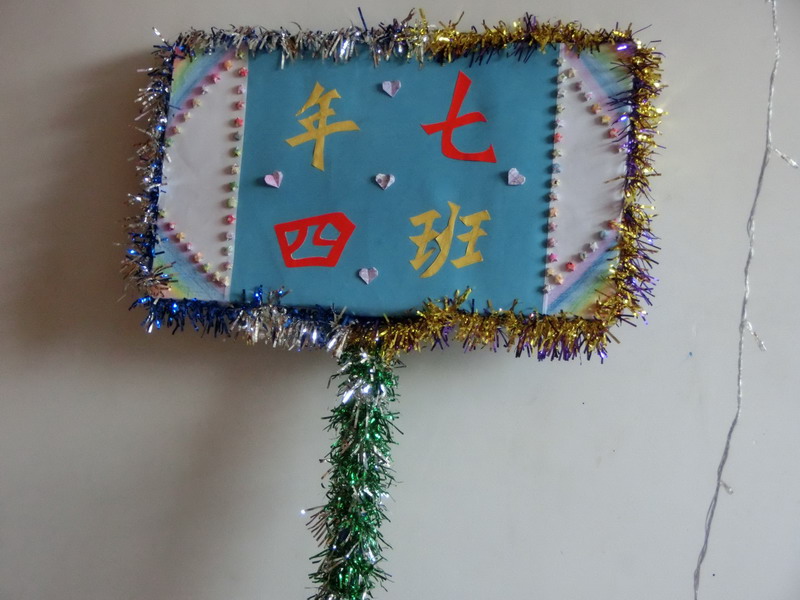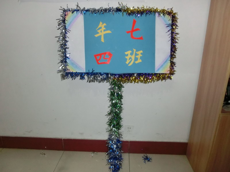 我们一共四个人,每人分工明确——字写得好的赵柄尧负责写字,王菲、房佳宁和我负责在牌子上装饰。说干就干,我们每个人得到自己的材料后就开始"工作"。赵柄尧写字,写了好几次都不是很好看,后来发现是把字写小了,于是一修改,漂亮的四个大字就出现了——七年四班!我们三个女生也通过一番努力装饰好了牌子,就差粘上赵柄尧的"七年四班"。