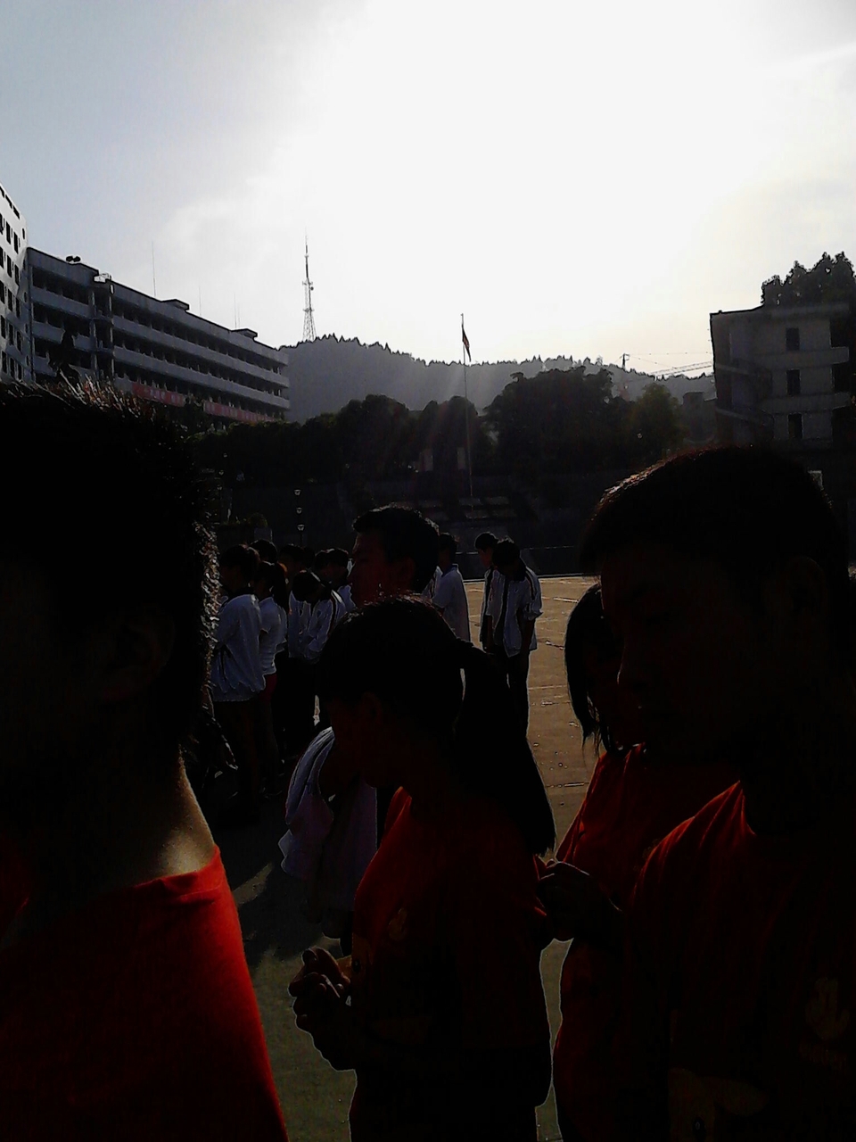 在所有的同学都到齐了之后,我们首先举行了升旗仪式,迎着初生的太阳 ,我们看着国旗缓缓升起,心里充满着感慨和振奋,注视着它到达它的顶峰!因为在列队所以没能拍到升旗时的照片。