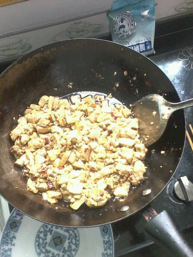 接着把油倒入锅中,等油熟后,放入两勺豆瓣酱,再放几颗花椒。等香味出来后,再把肉末倒入锅中进行翻炒。炒至七八分熟后,往锅中倒入准备好的豆腐,进行翻炒。