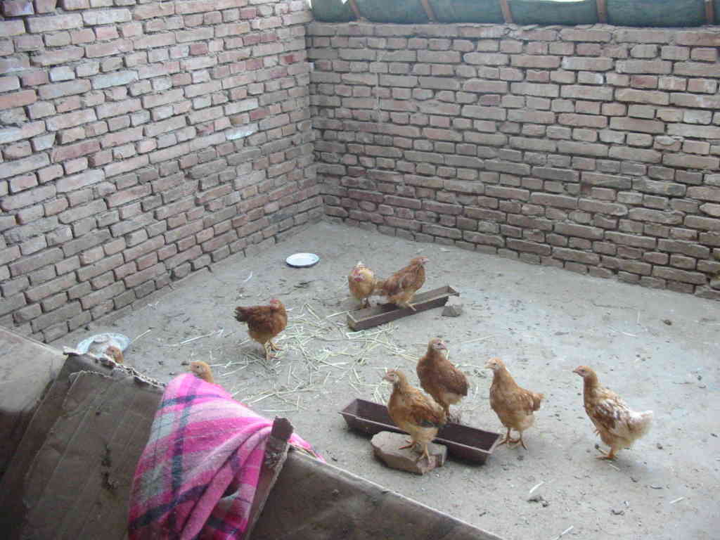 小鸡们吃完后就在自己的"小家"里转悠,它们的生活自在吧,比起城市鸡场里的鸡舒服多了。