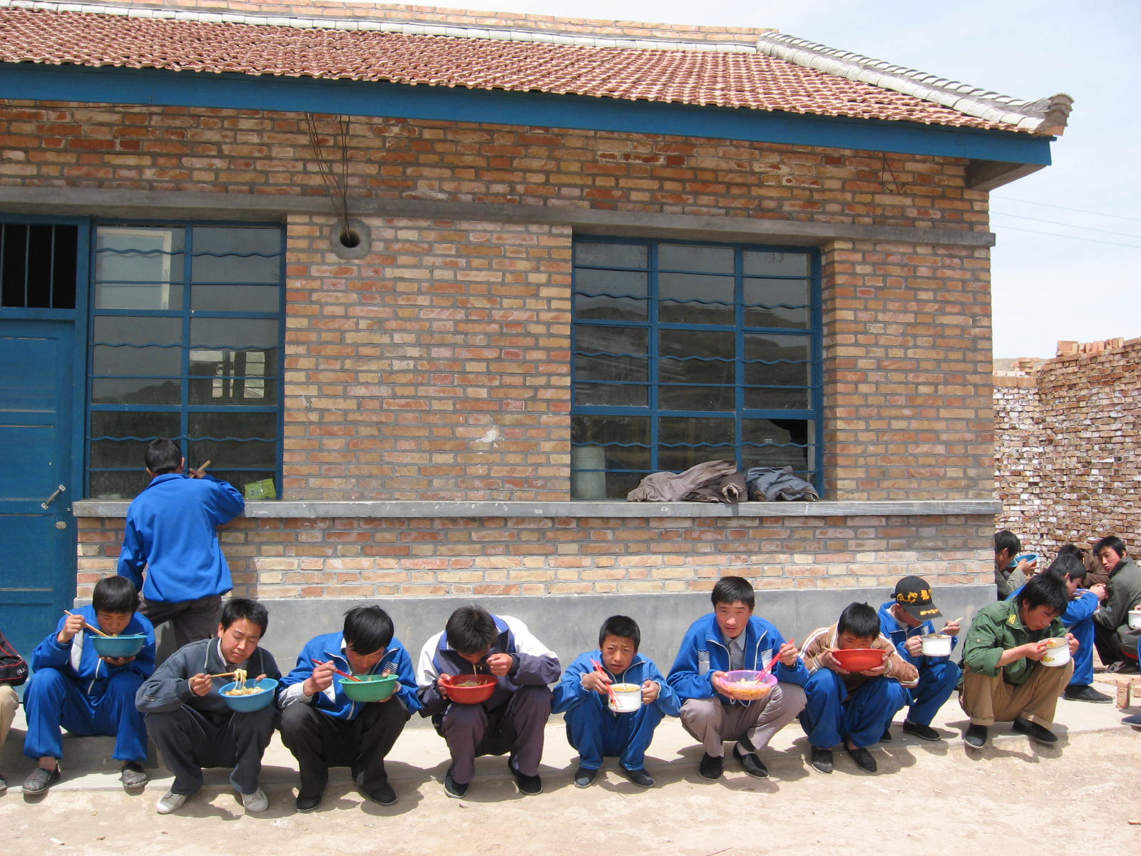 打上饭之后没地方去吃,就蹲在台阶上 ,整整齐齐的蹲一排,狼吞虎咽的吃;吃完之后又回到学习中。