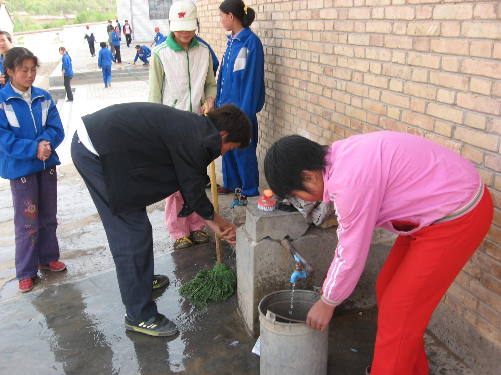 有喝水的、有刷牙的、有洗衣服的等,总之我们学校的这个"独生子"水龙头是多方面的使用。