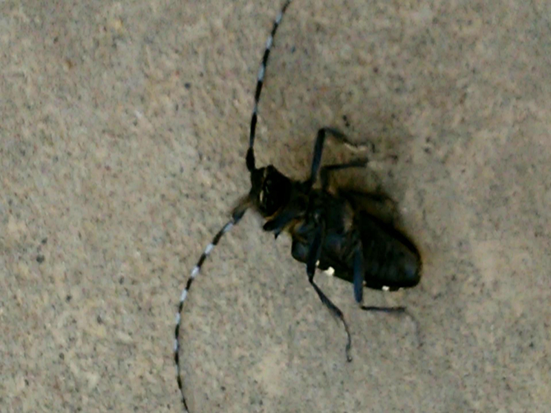 天牛的头部很光亮,两侧的"牛角"看上去很强大,让我顿时觉得天牛很强大,心想,真不愧是昆虫中的牛啊!不同的是天牛的"牛角"长在头的中部,而黄牛的"牛角"长在黄牛的头顶,难怪叫"天牛"啊!