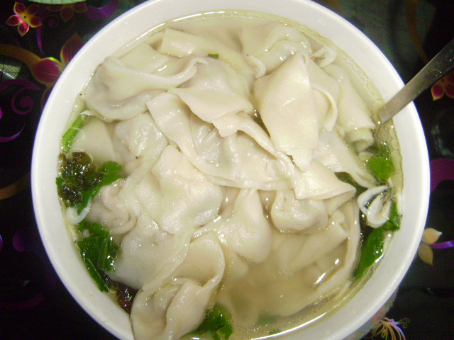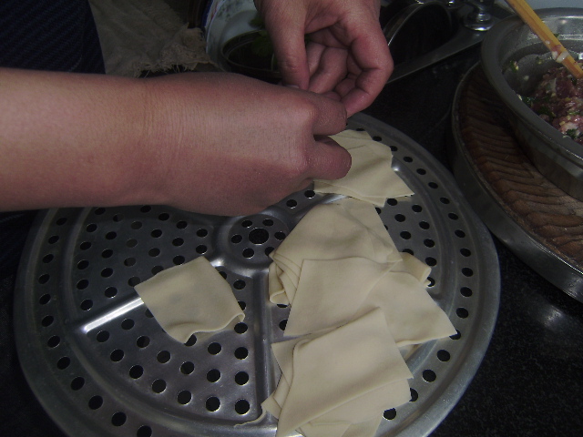 我先洗了一把手,便迫不及待地包起来,我轻轻地拿起一张皮,把它放在手心,用筷子夹了一些肉馅儿放在了皮子上,然后把皮子卷一下,把皮子两头弯向中间,用力使劲一挤,想把它们粘在一起,可是用力过猛,挤破了馄饨皮,馅儿冒了出来,我赶紧“急救”,用另一张馄饨皮补上,才算堵住了“洞口”。这边补好了,可是那边又破了,于是我又用了一张皮才把整个馄饨给包好。