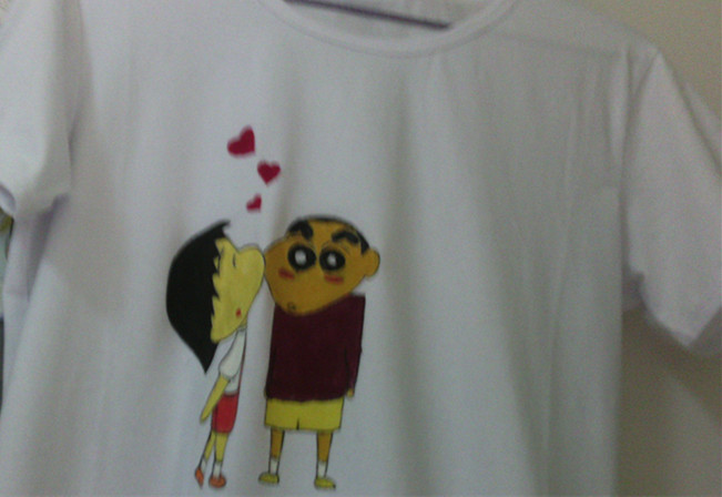这次我给大家带来的是一项非常特殊的艺术创作:"彩绘体恤"。当然衣服如其名,我们要在一件纯白色的体恤上画出自己喜欢的图案。而我这次所画的作品是:"蜡笔小新与樱桃小丸子"。 这可能也是一部我们90后小时候非常喜欢的一部动画片。但我却对此影响不太深,因为那时候我们家还没有彩电呢。当然你也不要纠结那我又为什么要画这个呢,我可以很明确的告诉你:有两点,第一点在体恤上作画难度十分的大,所以我选了一个看起来比较简单一点的。至于第二点嘛,那就不曰,不可曰。