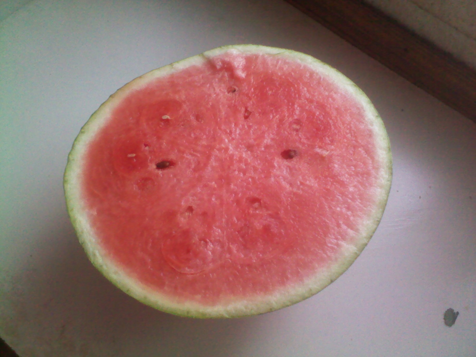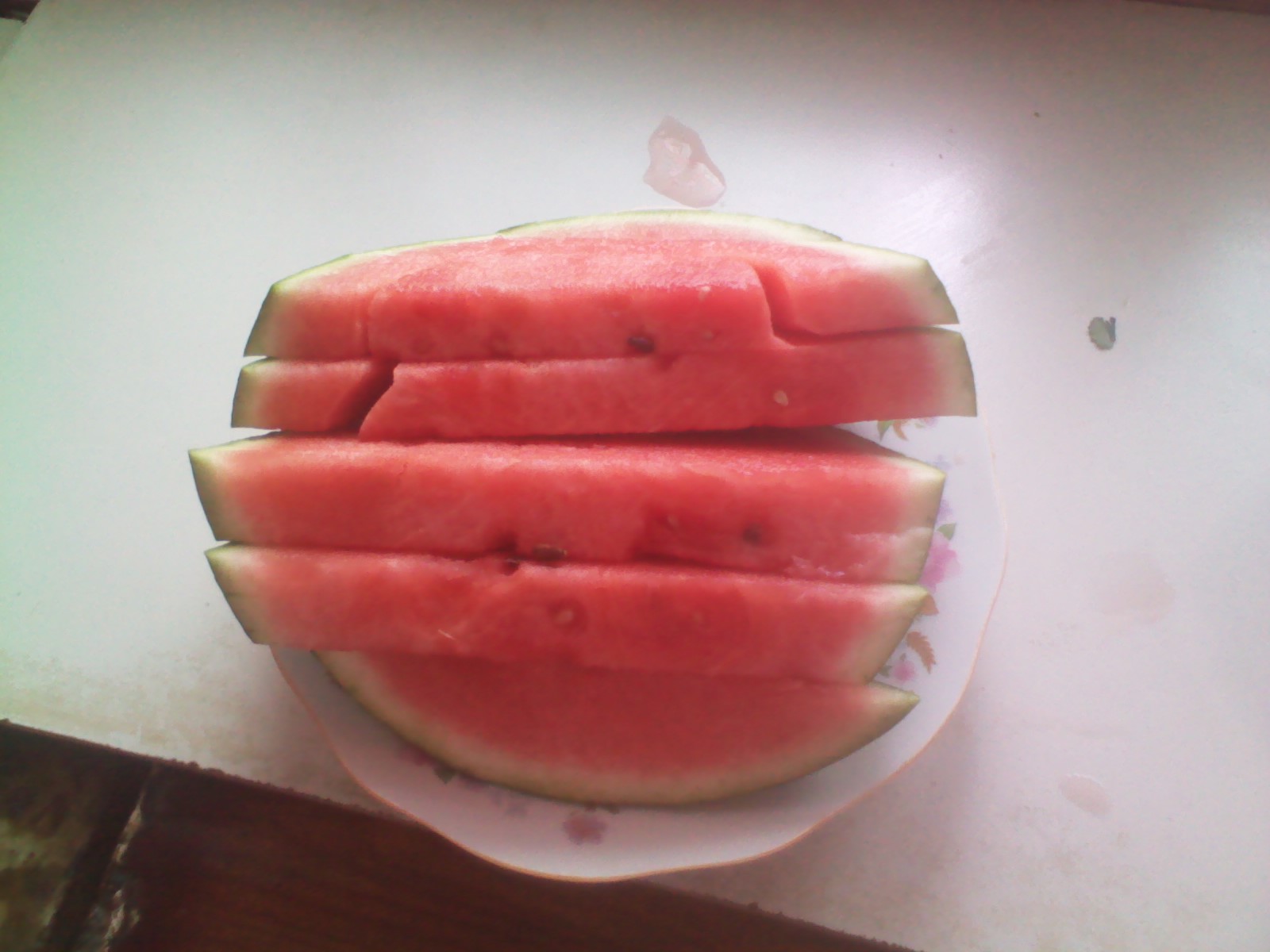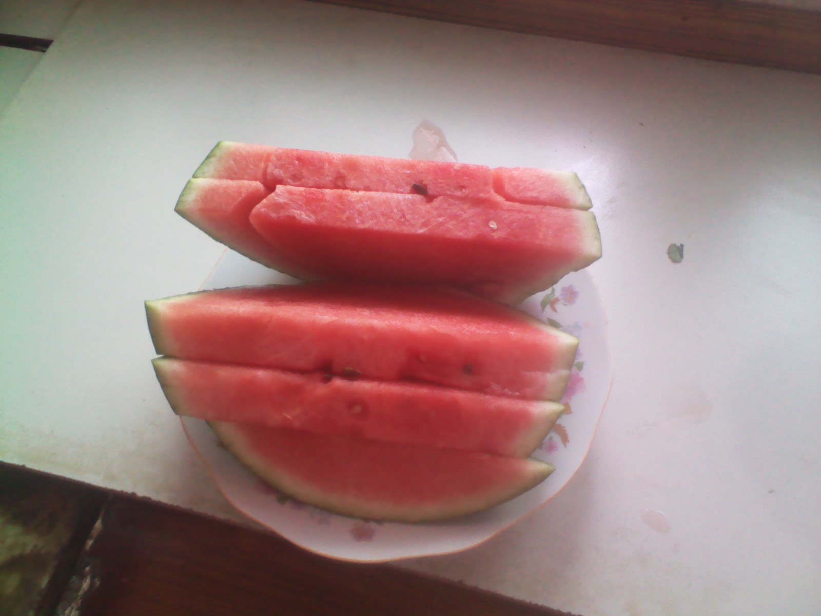 西瓜里面是红色的,切开来看那红彤彤的瓜瓤,晶莹剔透,让你看就忍不住想咬上一口,切的时候要切成一块一块的,这样吃起来也比较方便。如果吃多了,会感到一阵的肚子痛,不过,就算肚子痛我还是要吃,它吃起来甜津津的,美味极了。