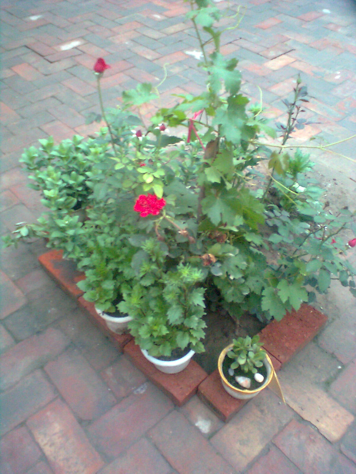 这样的光景大约过了一年吧,妈妈受不了院里的荒凉,东西奔波要来了几株花苗种在花盆里,它们快乐的生长,妈妈还移了几棵种到了小园子里,被剪断的玫瑰又发芽了,小枣树也冒芽了,真令人高兴。 直到今天,我家的小花园又回来了,只是面积缩的有点厉害,其它的还是一样。 那丛玫瑰迅速的发芽抽枝长叶,又和从前一样了,我每天浇水,它很快的结出了花骨朵,每只花骨朵的生长速度都不一样,有的还是花骨朵,有的花蕾完全张开像一个五角星,有的已是待放的花苞红的像要滴出水来。