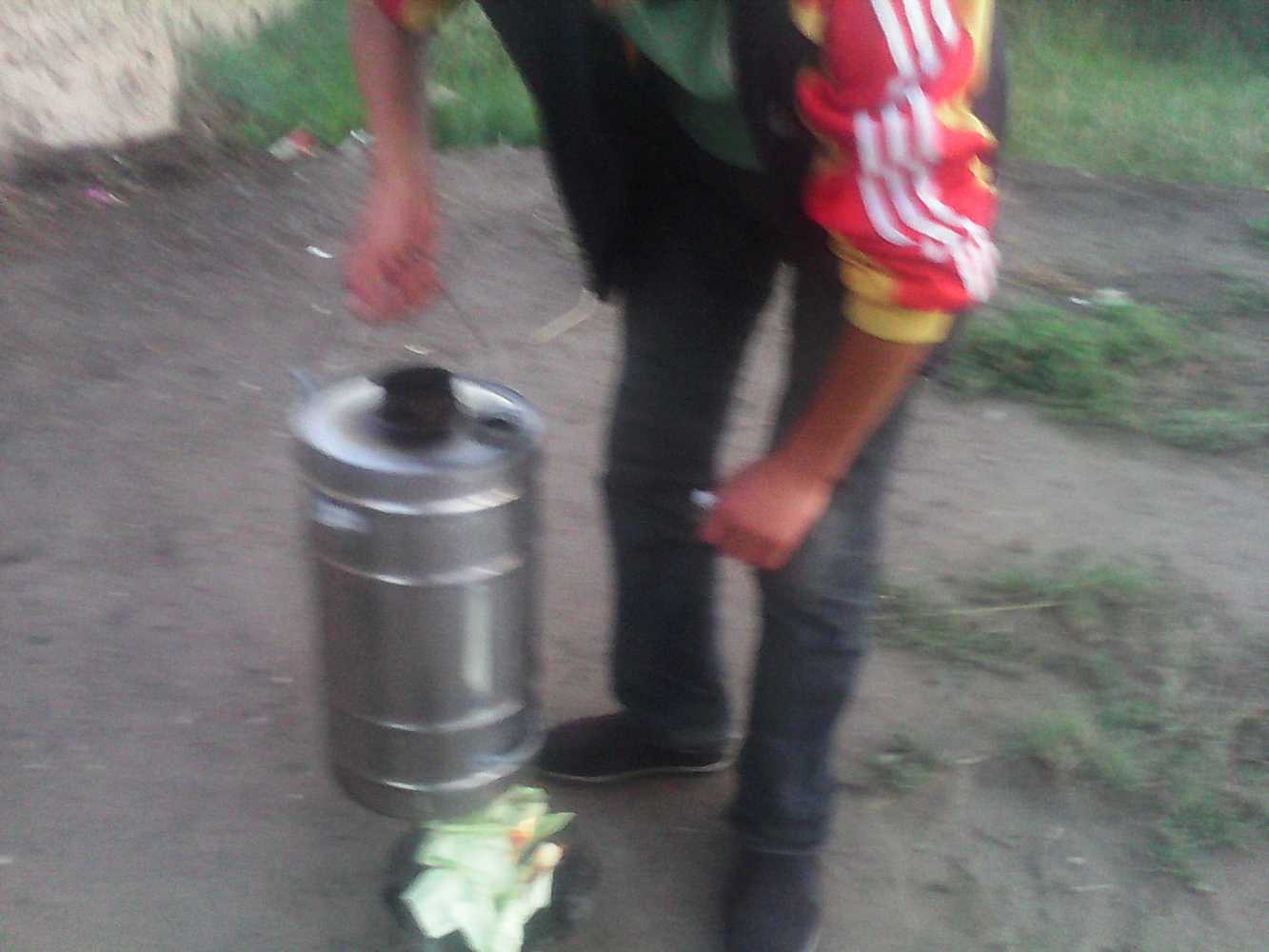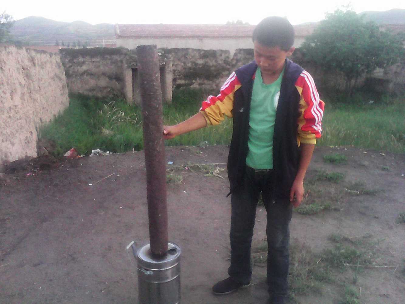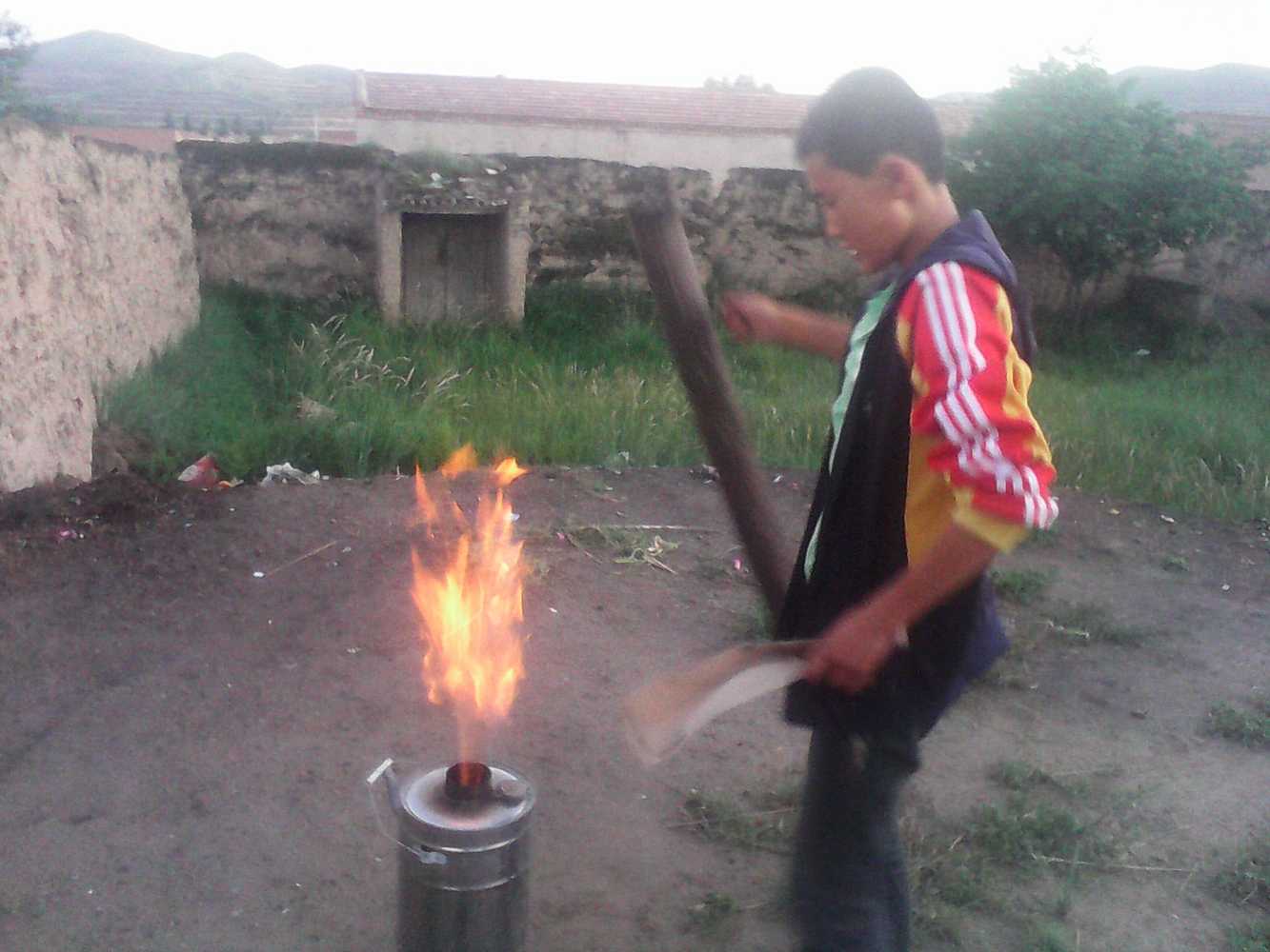 自从我们在永登租了房子以后,为了节省钱。我们院子里的一位阿姨买了一个用柴烧水的烧水器。那个壶样子怪怪的,是铁皮做的,在上方有一个壶嘴和手提的耳鬓。总体上看是一个圆柱体,下面还有一个底座,是圆形的。
