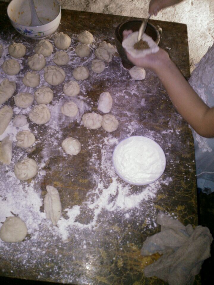 时间也差不多了,把刚切好的馅放在旁边,手灵活的摆弄着,一分钟都不到,婆婆就包好一个;看着眼馋的我,也想上去显示一下;刚开始面在我手里,是粘糊糊的,弄到桌子上、身上全是面。使我好奇的是婆婆把香油摸在手上,再把面一点点地扒拉下来。第一个总算完成了,看看婆婆包的,再看看自己的,我都不好意思拿出来,和婆婆包的相比,简直是天壤之别,自己惭愧极了。看起来简单,做起来难。