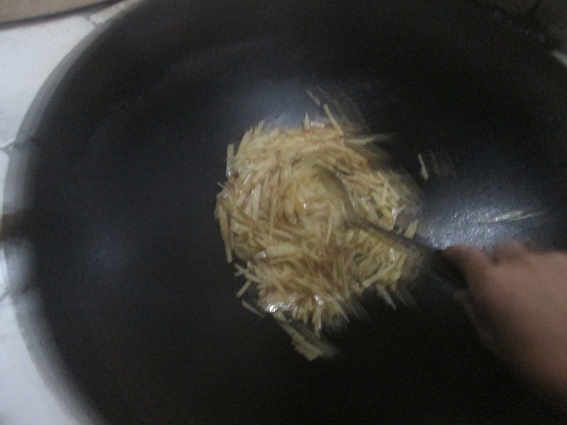 开始炒菜了,我洗干净了锅,把油往锅里放,等油开了,冒油烟了,我迅速的把葱姜倒入锅内,锅里发出霹雳啪啪的声音,油花四溅,怪吓人的。我手里拿着装土豆的碟子,把土豆丝倒入锅中,"哗啦"一声,"哎呀!"我的手被烫到了,好痛呀!我忍痛接着炒,然后加入味精便上盘了。