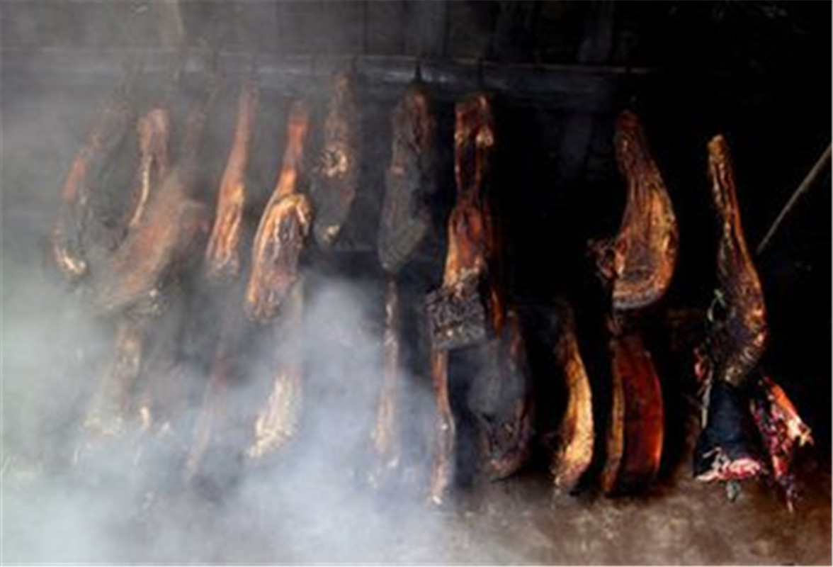 杀好的猪肉被分解成条块,放凉了,将盐、花椒、辣椒面等炒了,均匀的抹在每一块肉上,放进缸里腌半个月,等入了味,再捞出来,挂在房梁上,用柏枝、香椿叶燃烟熏干。那一段时间,满屋子都有一股熏肉的香味。小孩子嘴馋,没人的时候就偷偷的撕下一块来,放进嘴里慢慢嚼,满口溢香。现在,人们听说熏肉容易致癌,就改为自然风干。