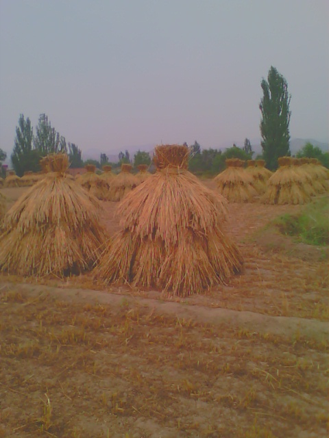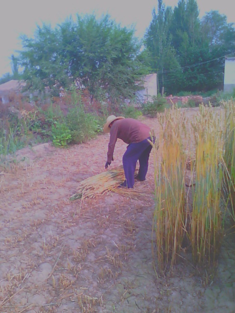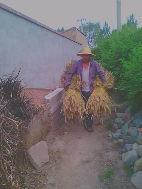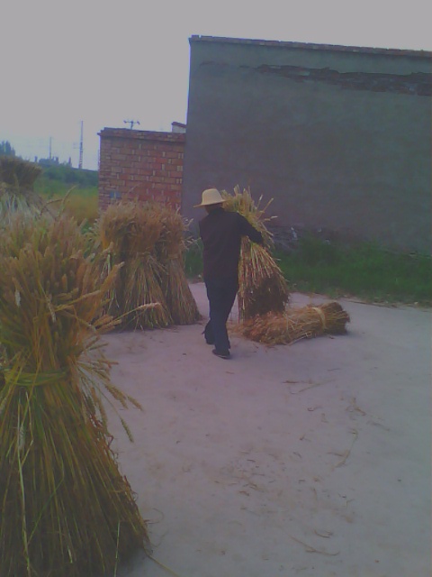 我刚走过去就看见二奶钻在麦中,唰唰唰地不到一分钟,她的旁边就整整齐齐的放着一排麦子。这时,二爷过来就开始捆了,最后我们就把那些麦捆从墙后抬到我家门前的场地上,垒了起来。