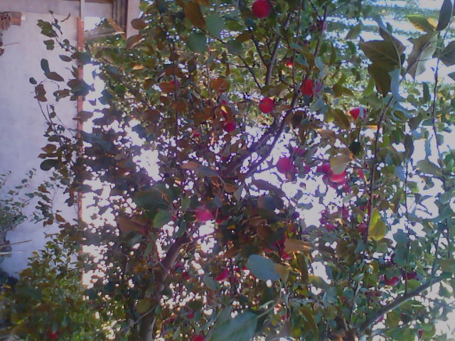 不信,你瞧,推开大门。你会看见一棵苹果树,那红彤彤的苹果一定会让你馋的直咽口水。走到树下你肯定会闻到芳香扑鼻的苹果香,使人顿时精神气爽,再往前走你会看到一栋菊花和几棵生菜,它们你拥我挤头仰得很高,仿佛在观看远道而来的客人,这时已经到了院子中间,不知从什么时候起院子里出来了一棵桃树,才过了几周的时间,它已经是枝繁叶茂了。一阵微风拂过,那棵桃树便向客人频频点头。